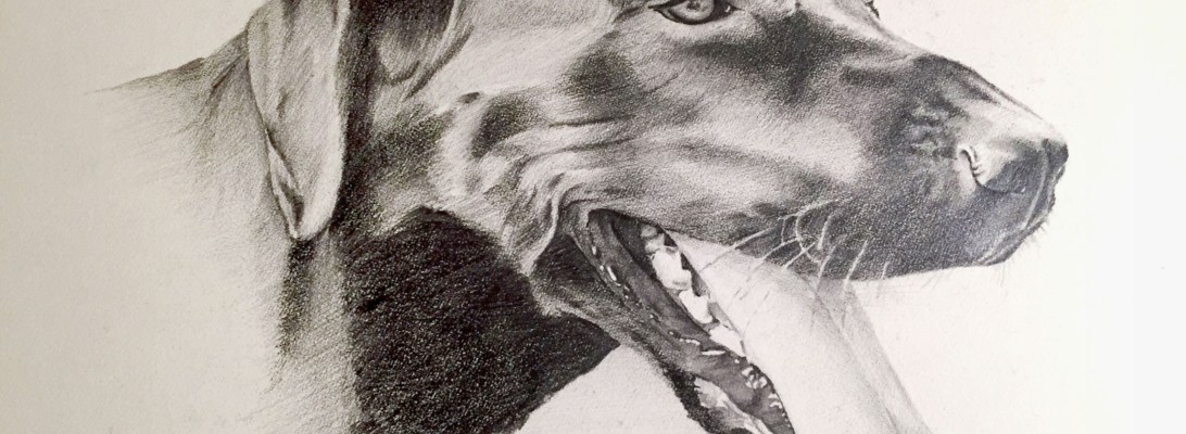 My brother’s Labrador retriever, Killian, was quite an energetic dog. Getting to stand still long enough for a reference photo was quite a challenge. In the end, this was a composite of a c couple different photos. The open mouth, panting tongue, with just a hint of saliva forming at the tip of the tongue captured Killian’s exuberance well.